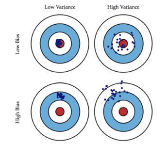 그러므로 low bias, low variance 모델이 되도록 하여 예측값이 서로 뭉쳐있게 해야한다.