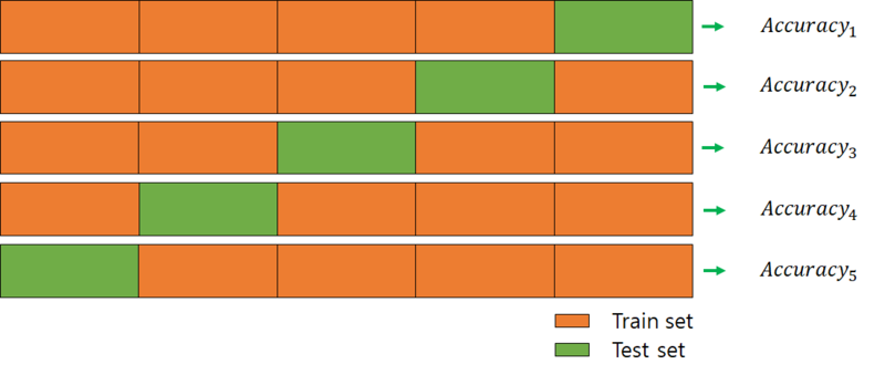 위처럼 전체 데이터를 나누어 일부는 Training Dataset으로 일부는 Test Dataset으로 설정하여 N회 테스트를 진행하게 된다.